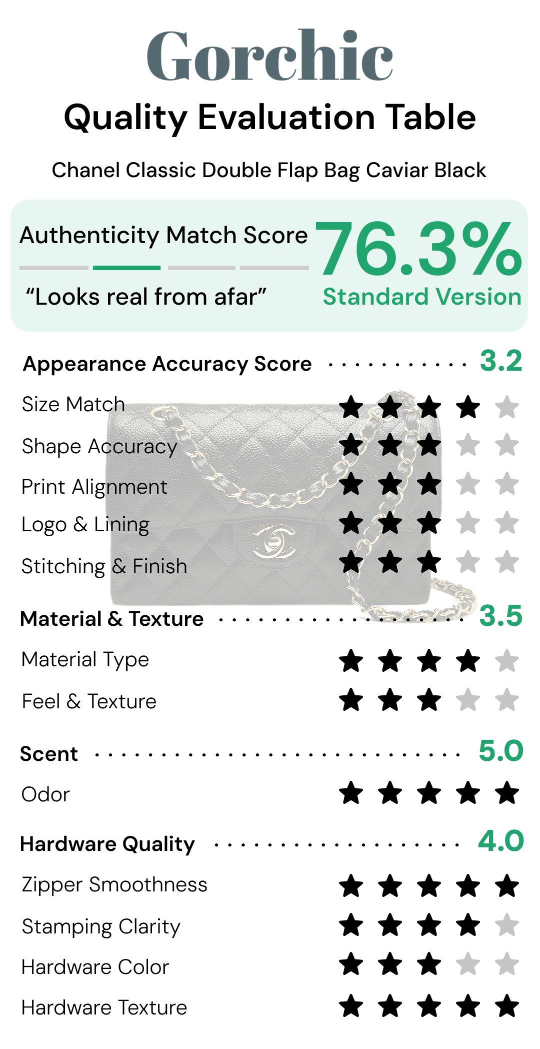 We score each bag on appearance, leather quality, smell, and hardware, then calculate a total CC Classic Double Flap Caviar Bag authenticity rating.