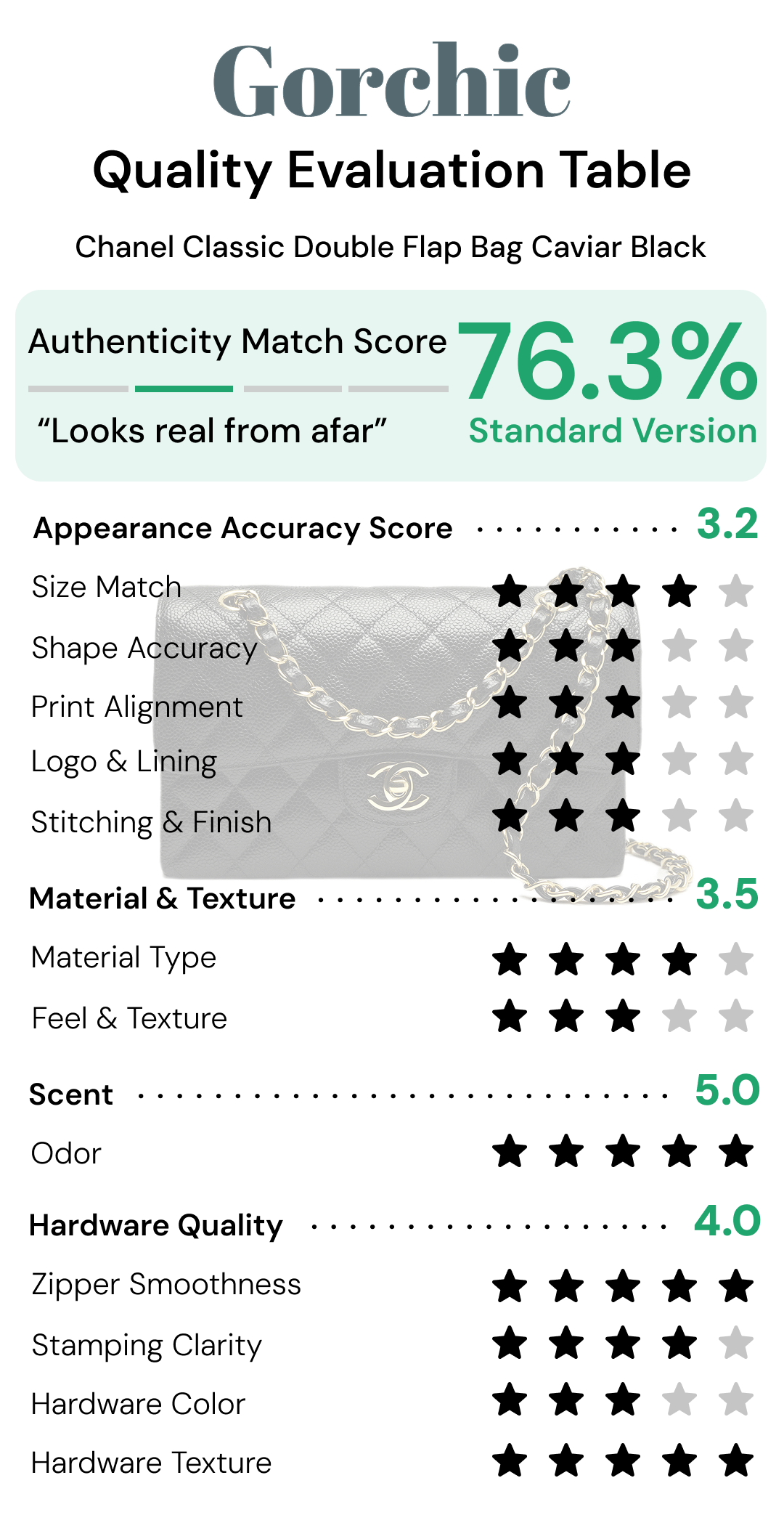 We score each bag on appearance, leather quality, smell, and hardware, then calculate a total CC Classic Double Flap Caviar Bag authenticity rating.