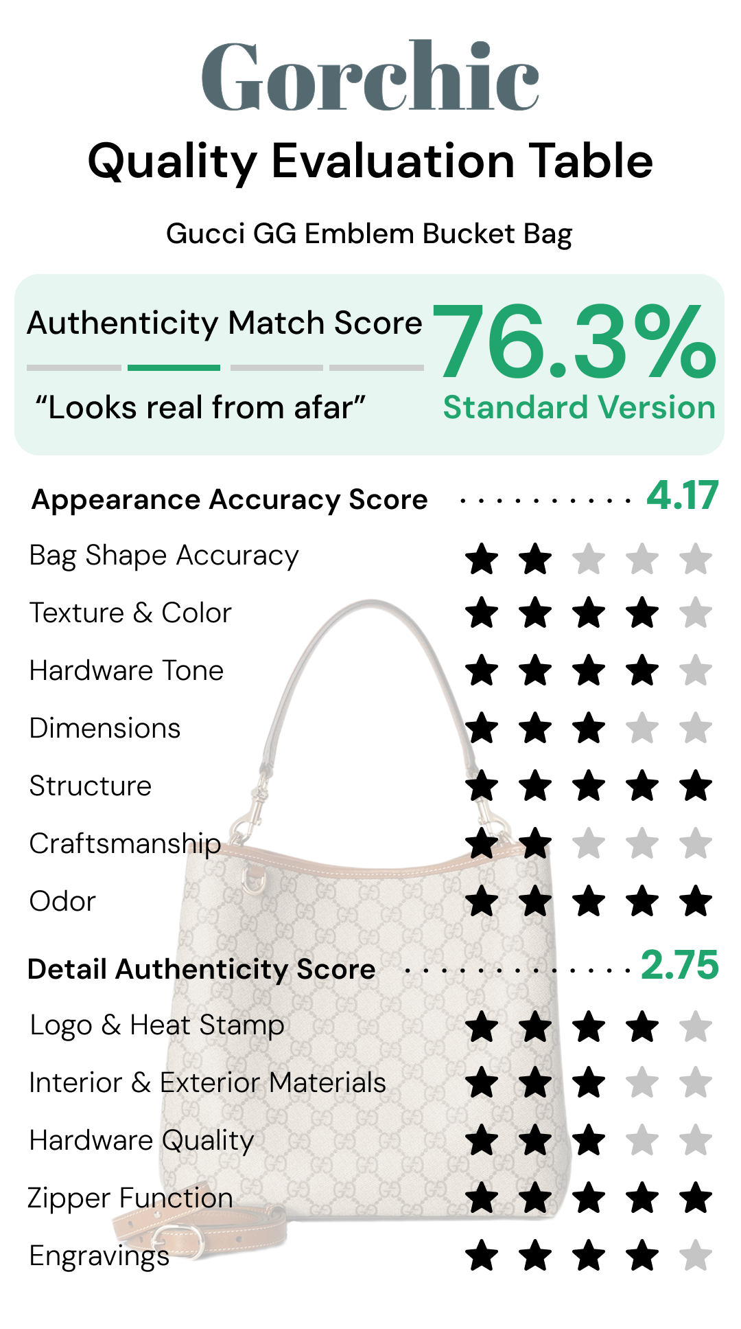 With a 75% authenticity match, this Gorchic-selected version GG Emblem Medium Bucket Bag is convincing enough at a social distance, though close inspection will reveal flaws in craftsmanship, leather trims, and bag shape.