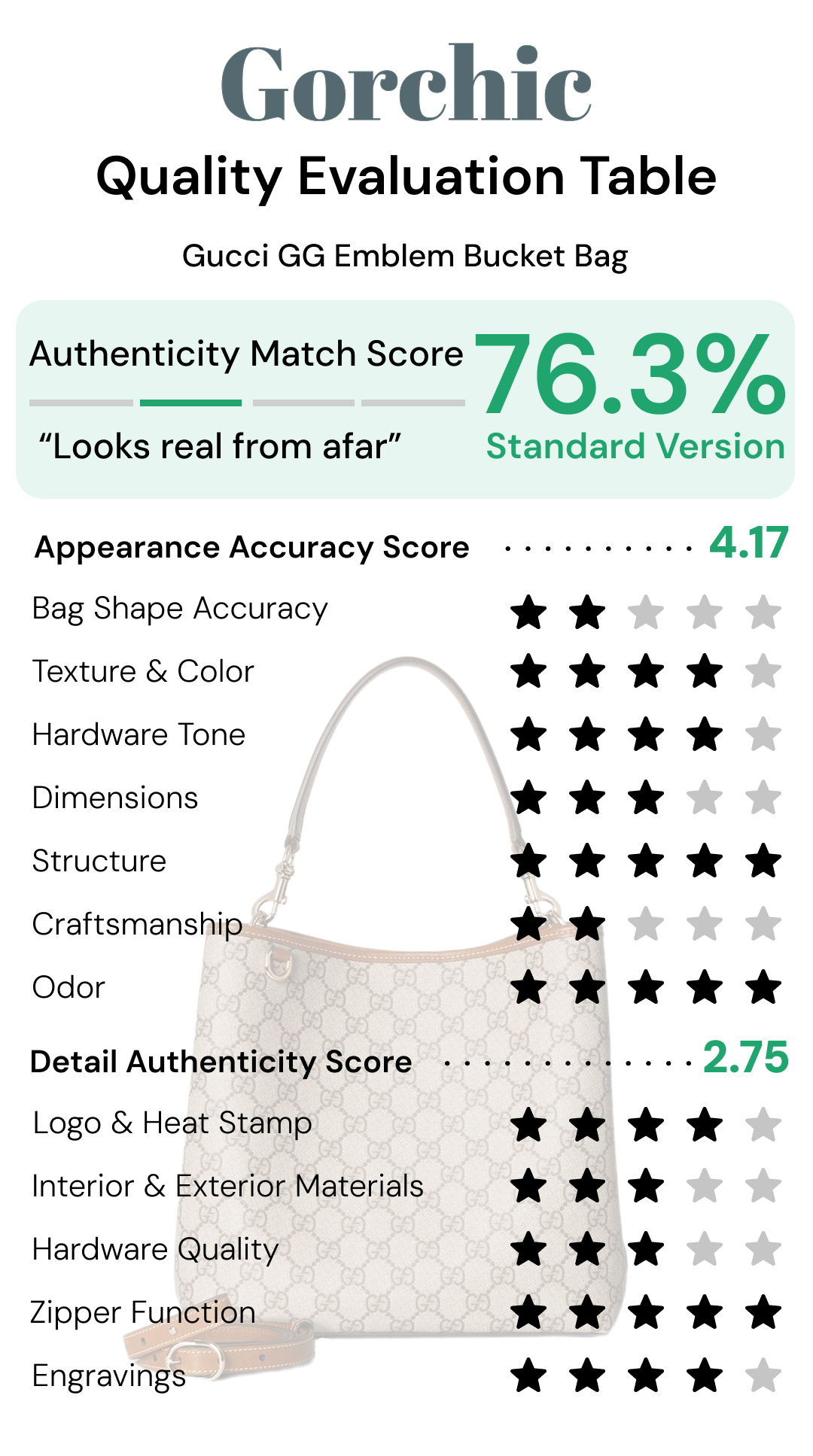 With a 75% authenticity match, this Gorchic-selected version GG Emblem Medium Bucket Bag is convincing enough at a social distance, though close inspection will reveal flaws in craftsmanship, leather trims, and bag shape.