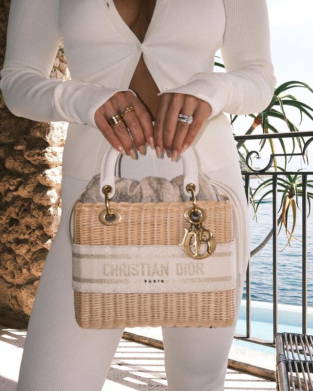 D Inspired Lady D Inspired Natural Wicker and Blue D Inspired Oblique Jacquard Handbag - Bag