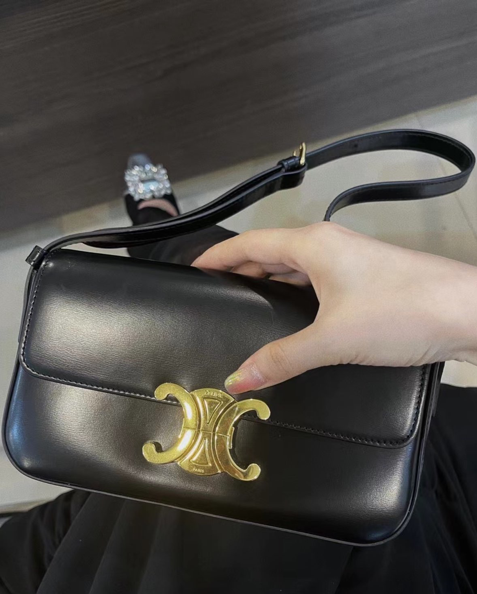 CALFSKINLAMBSKIN LININGGOLD FINISHINGSHOULDER CARRYTRIOMPHE METALLIC CLOSUREONE MAIN COMPARTMENTONE INNER FLAT POCKETADJUSTABLE STRAP WITH A MINIMUM DROP 8 IN (21 CM) AND MAXIMUM DROP 10 IN (25 CM)