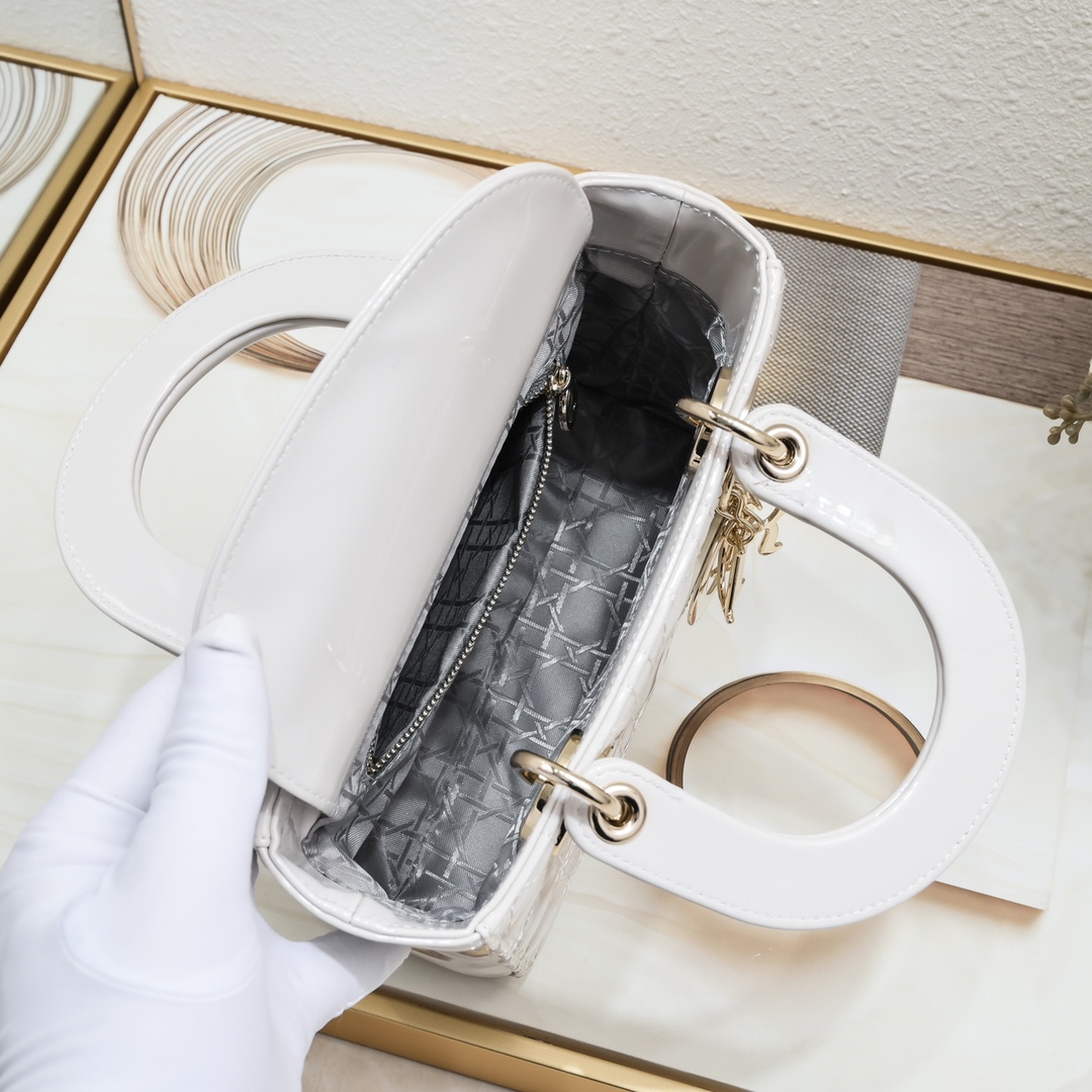 D Inspired Small Lady D Inspired Bag Powder White Patent Cannage Calfskin Golden Hardware - Bag